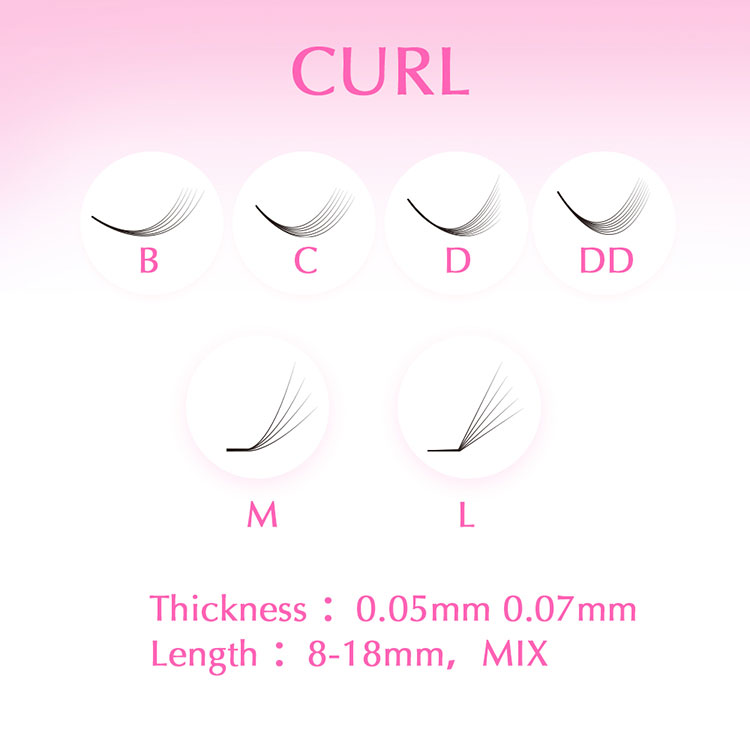 Választható specifikáció: Különböző hosszúságban (8-16 mm), D számban (2D-14D, 20D), vastagságban (0,05, 0,07, 0,10) és hegyes/lapos alapkialakításban kapható, különféle stílusokat lefedve, mint például a napi smink, a színpadi vastagság és a varrat nélküli smink.