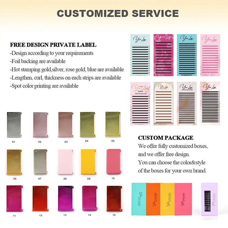 Az SP szempilla testreszabási lehetőségek széles skáláját kínálja a V-alakú szempillapurkolók számára, ideértve a szabadalmaztatott márkákat és a csomagolást, az alacsony minimális megrendelési mennyiséget és az ingyenes tervezési támogatást. Mielőtt ömlesztett megrendelést bocsátana, kérjük, magabiztosan tesztelje a minőséget a rendelkezésre álló ingyenes minták segítségével.